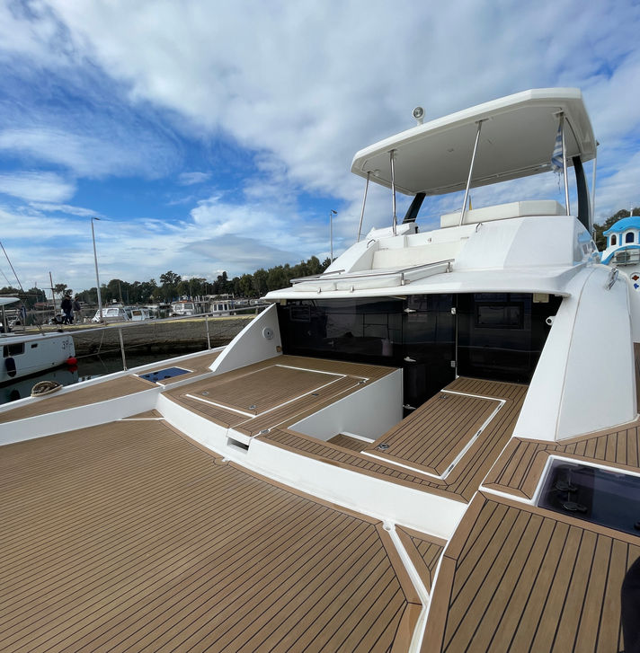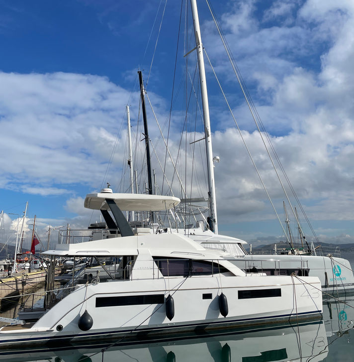 The Leopard 43 is a 43 ft power catamaran that blends style, comfort, and performance.